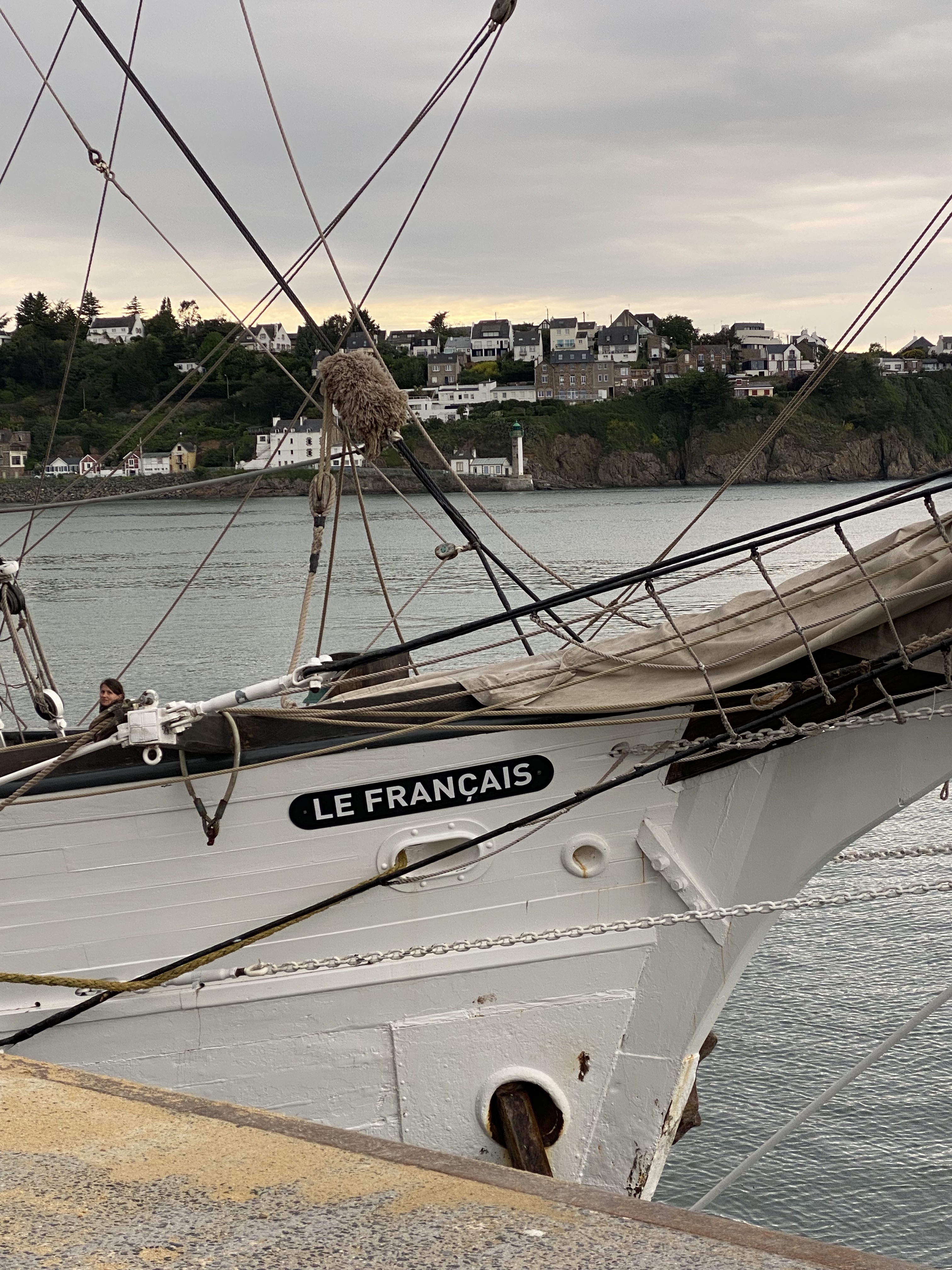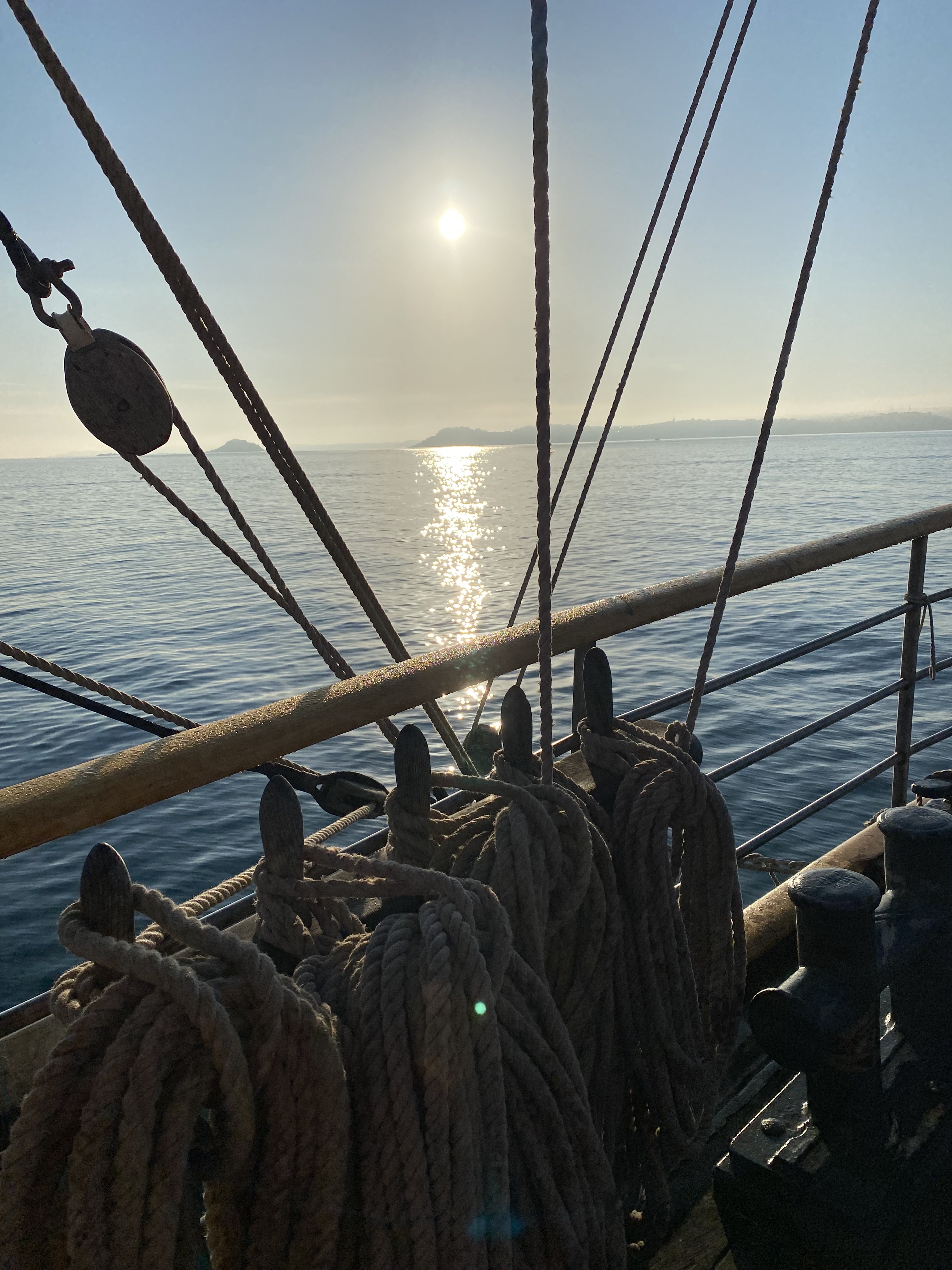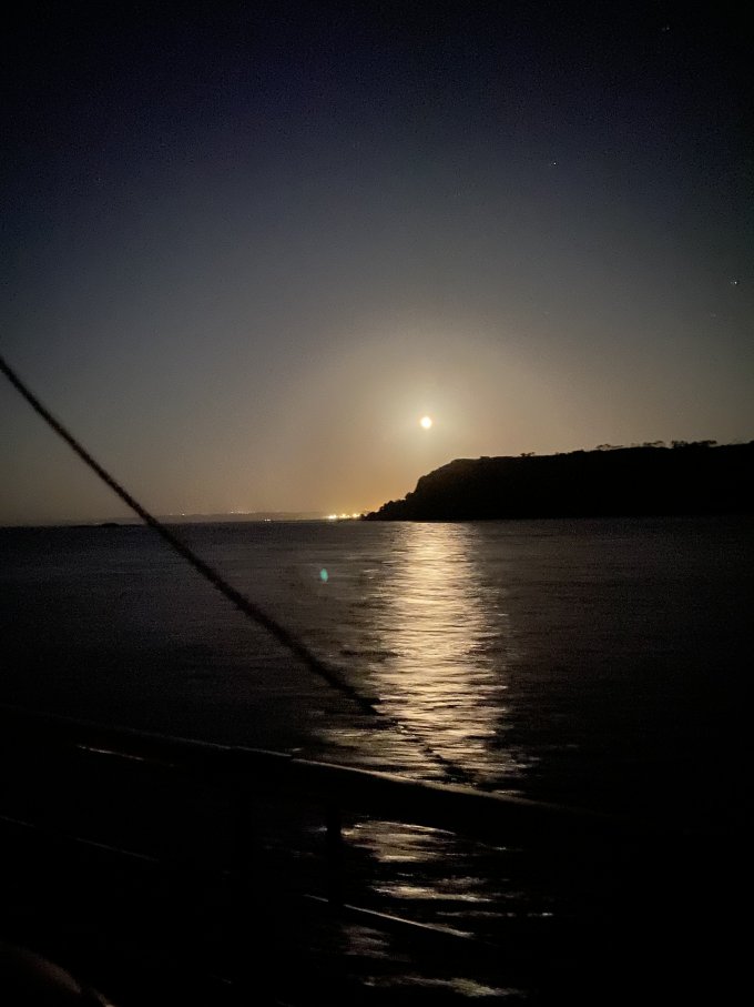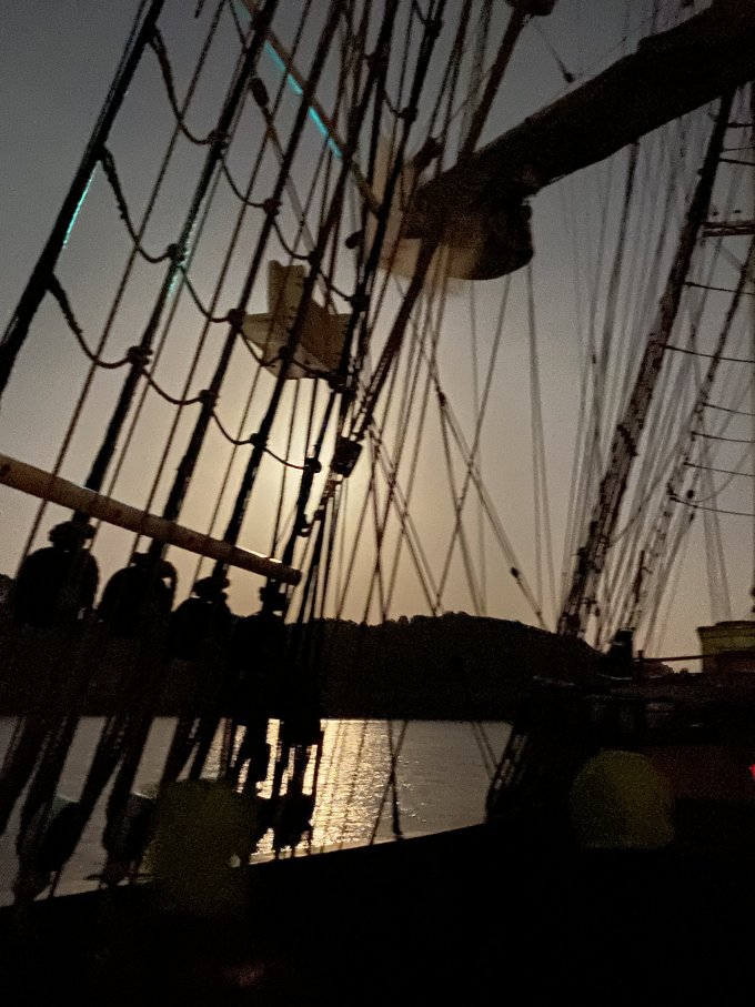 Appareillage à 5h du matin, au clair de lune, petit déjeuner sur la dunette. Route vers la rade de Brest :