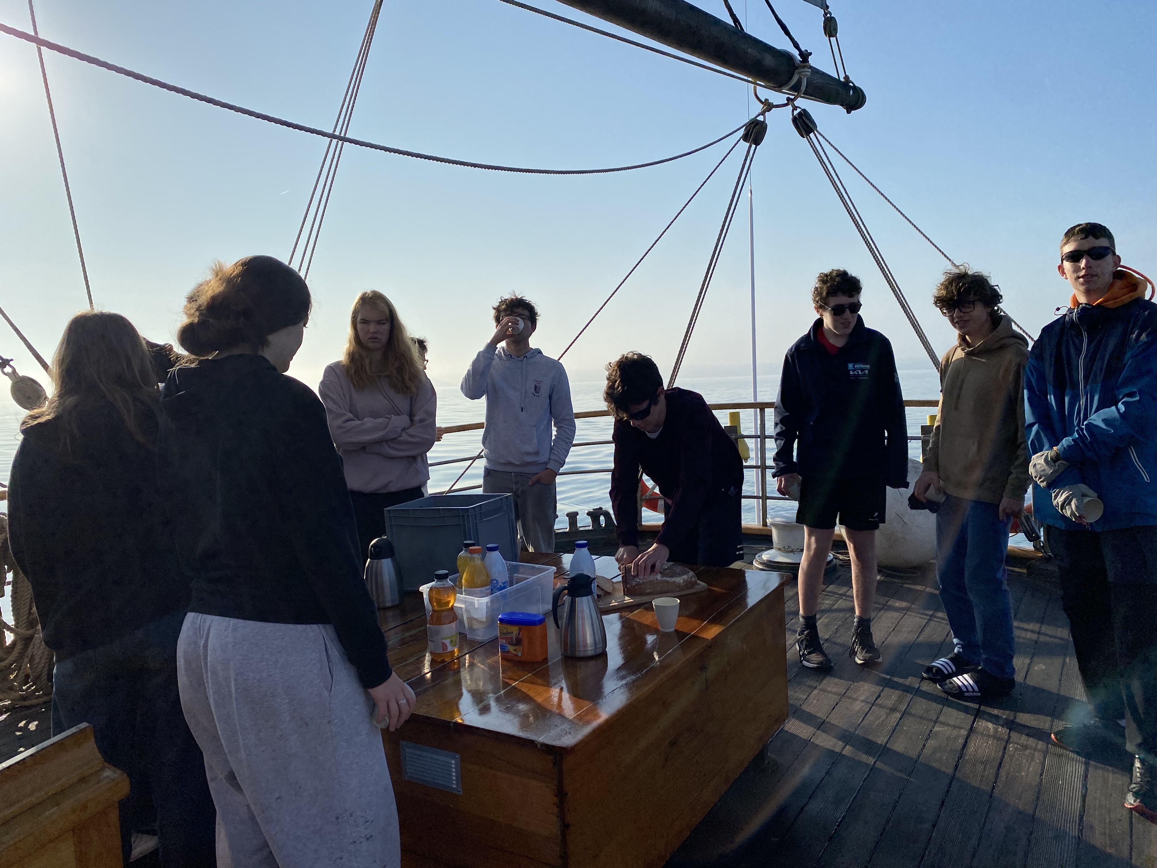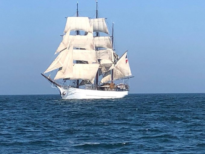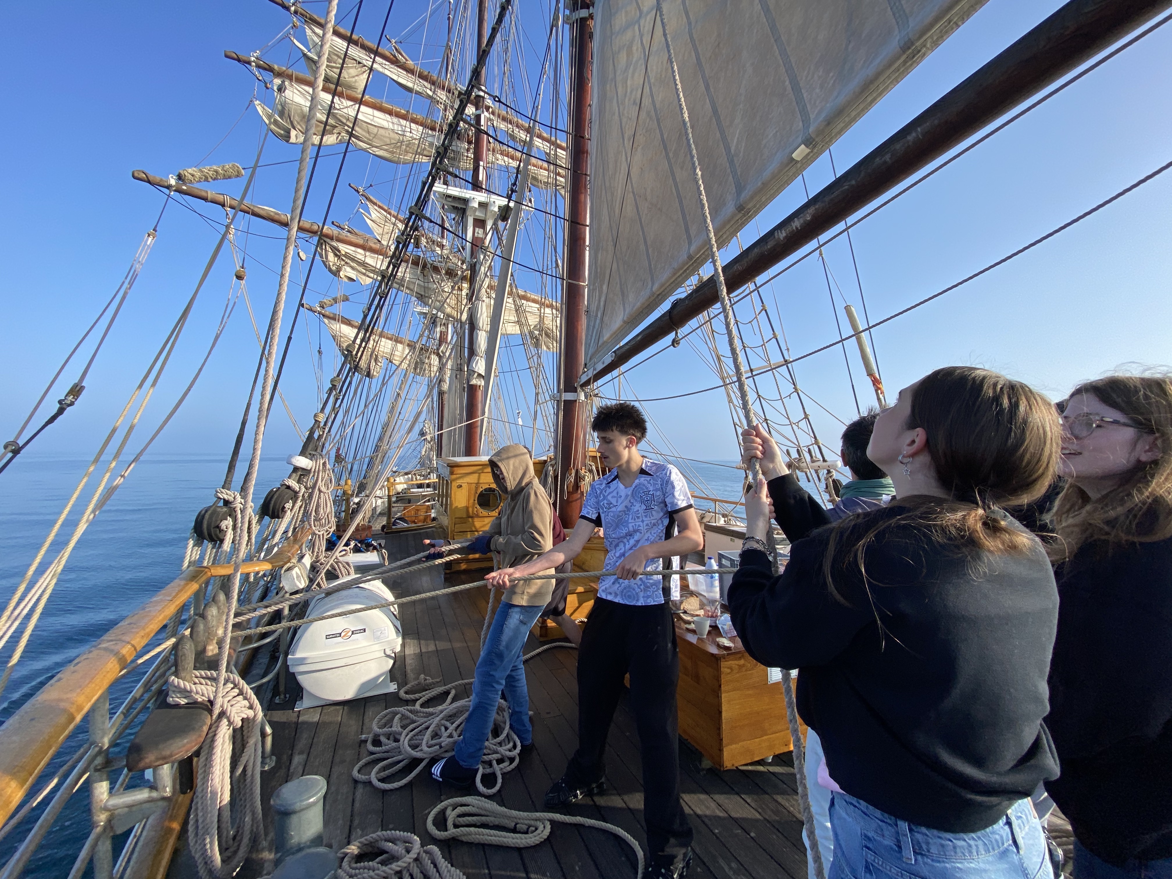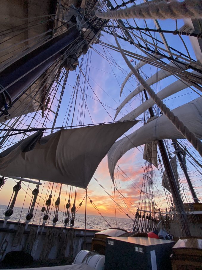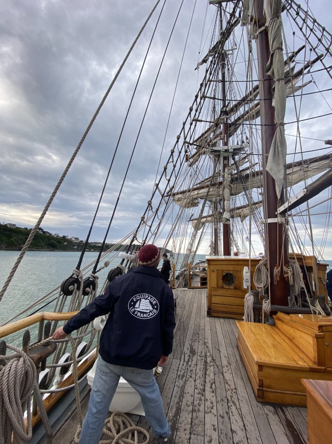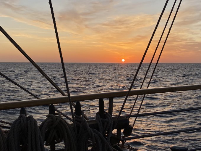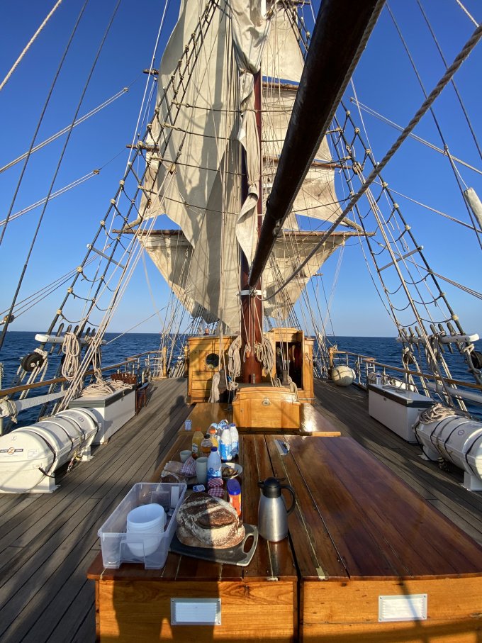 Appareillage au matin sous le soleil et petit déjeuner sur la dunette. Chacun prend son quart, participe aux manœuvres et fait le point sur la route du navire