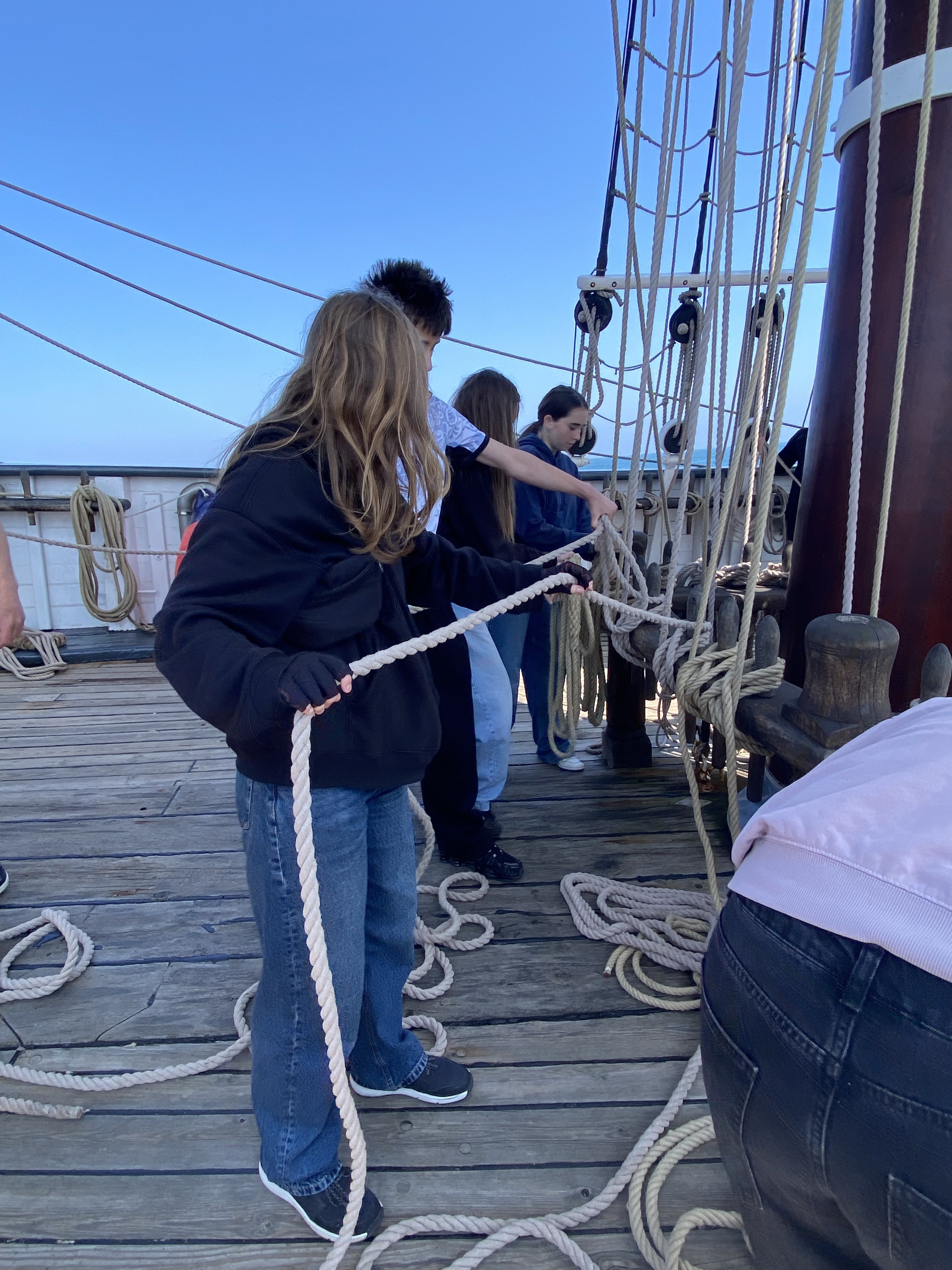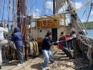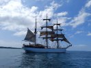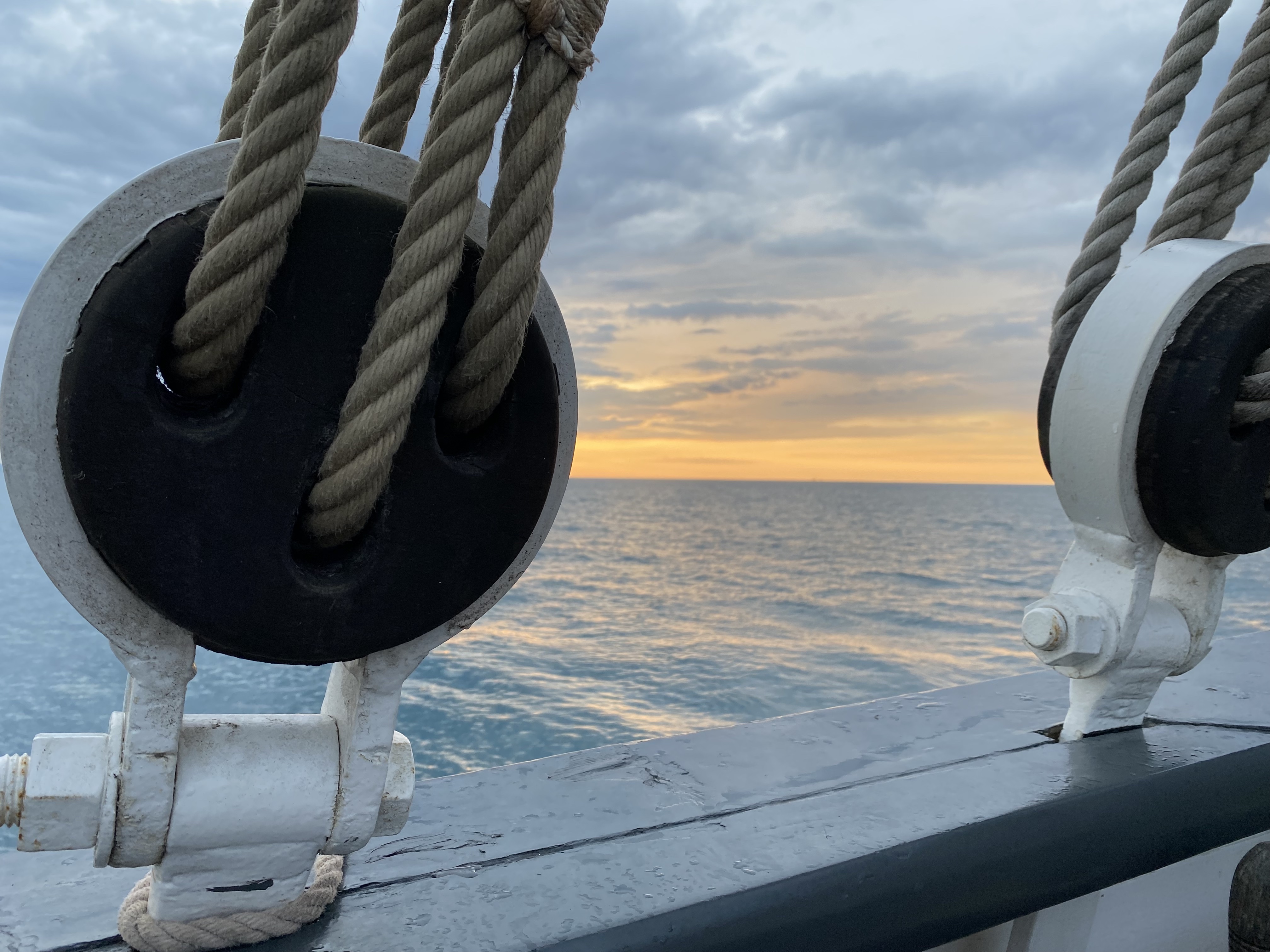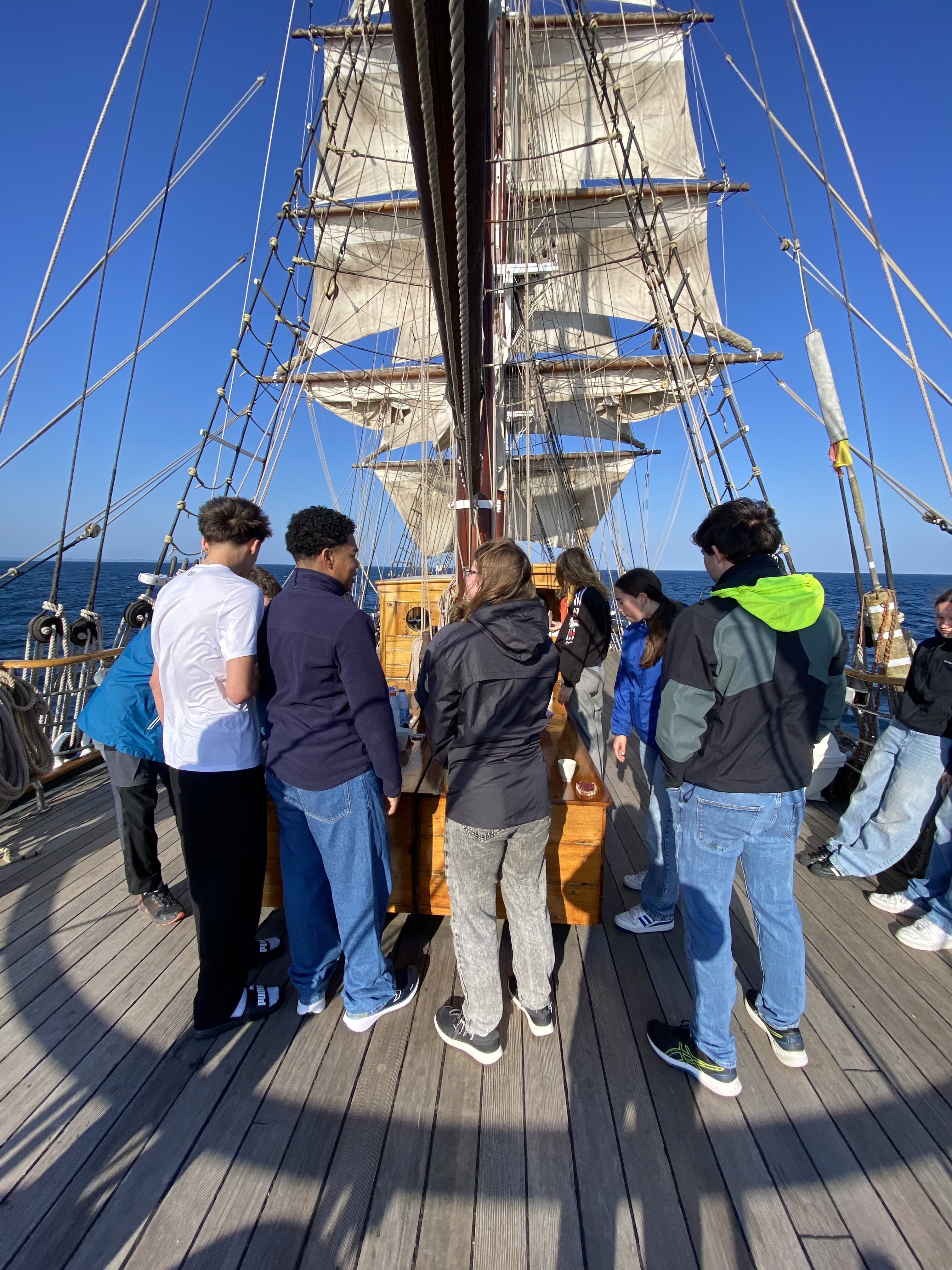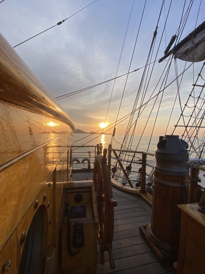 Appareillage au matin sous le soleil et petit déjeuner sur la dunette. Chacun prend son quart, participe aux manœuvres et fait le point sur la route du navire