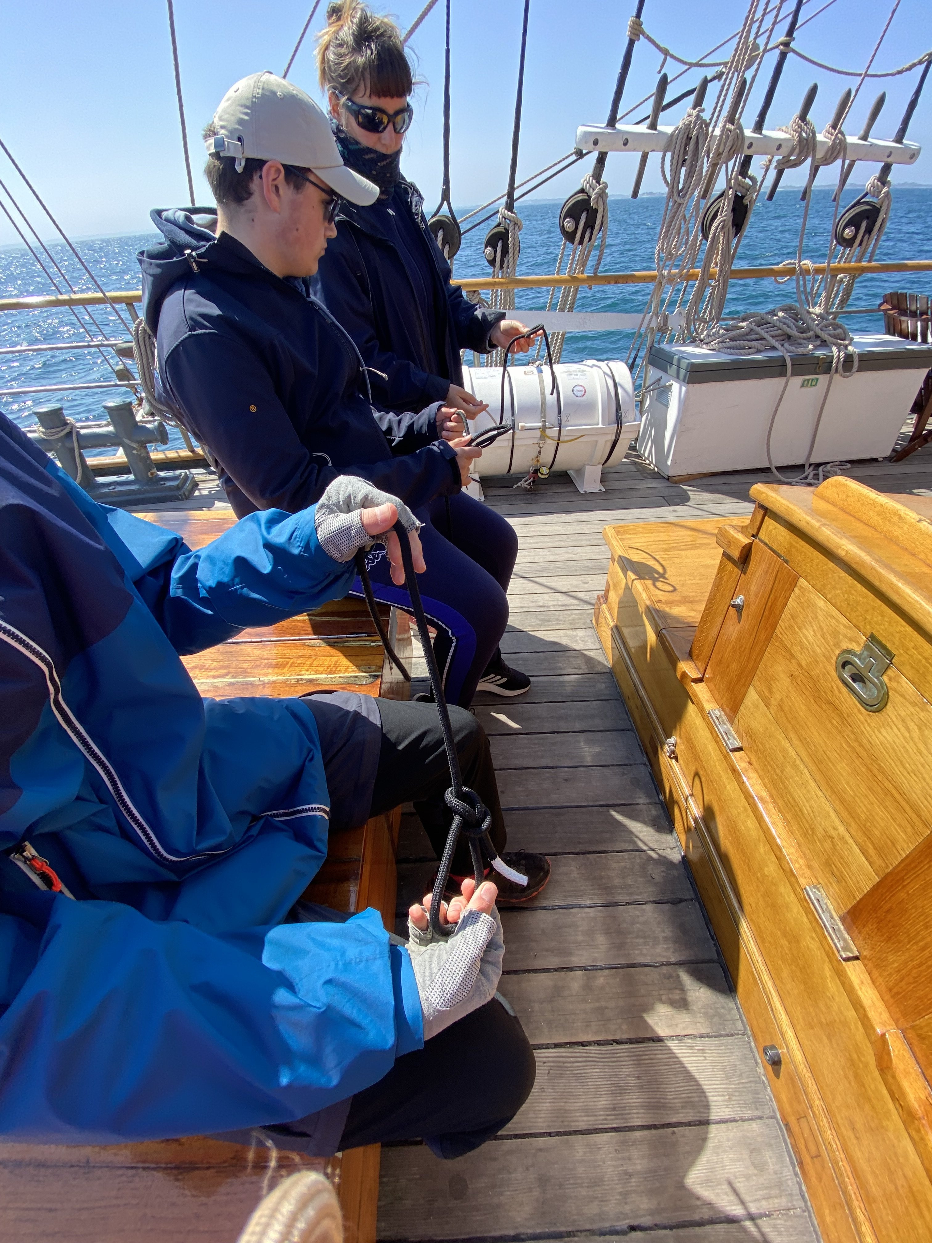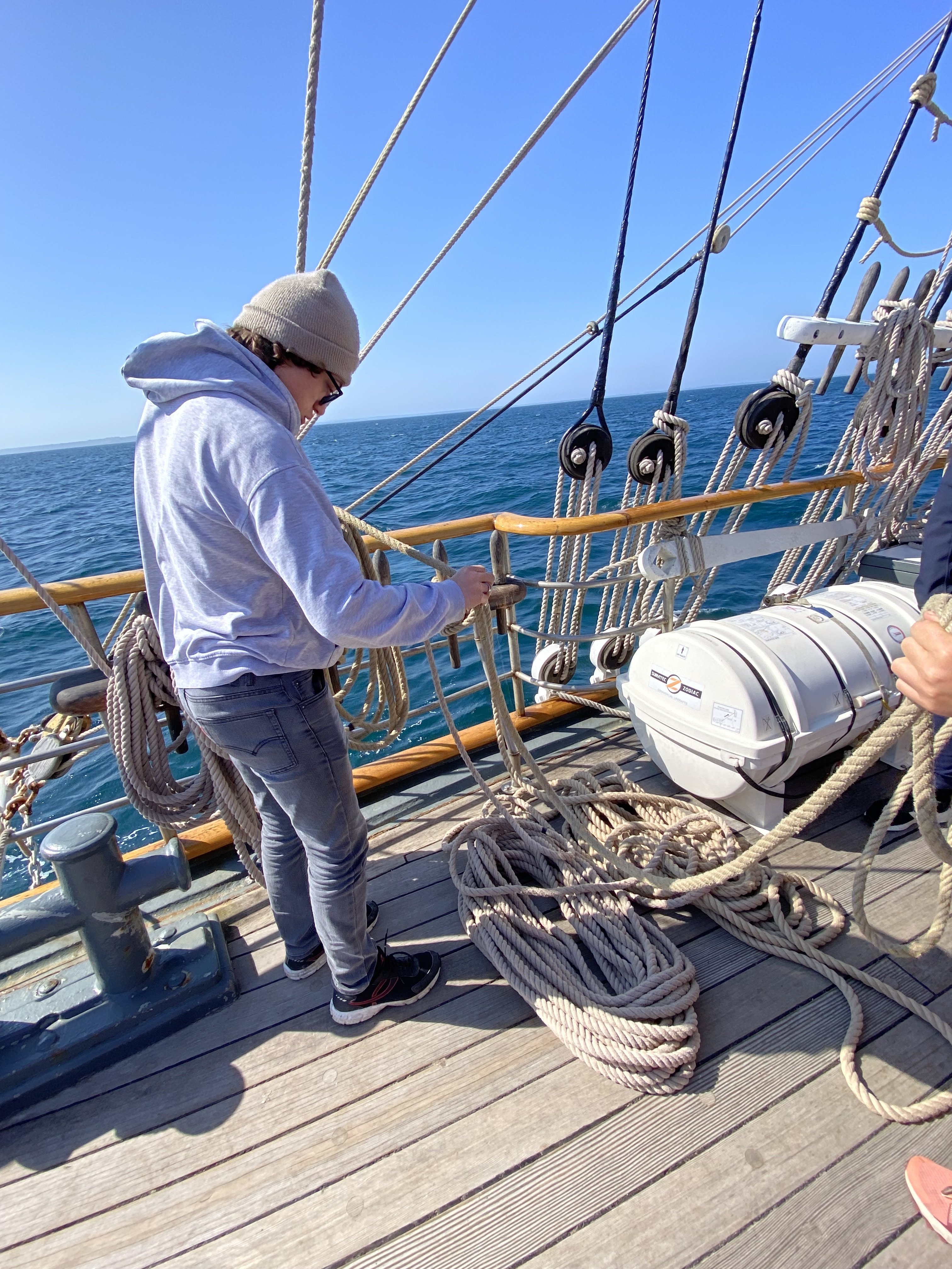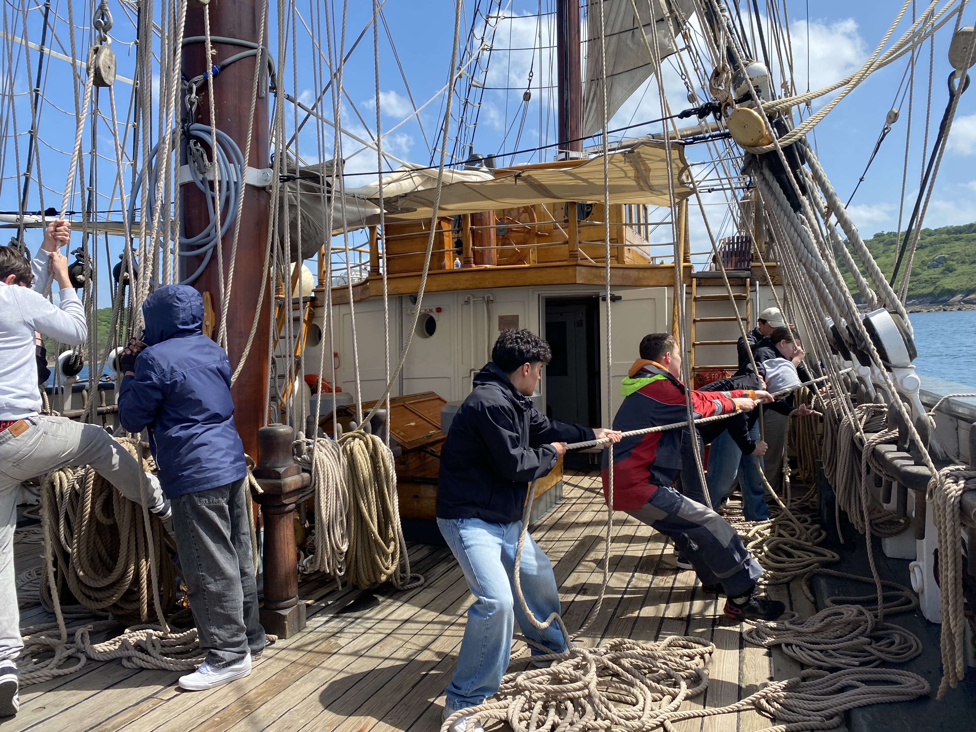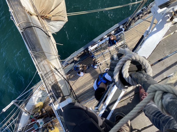 Mouillage dans l’après-midi au large de Perros-Guirrec. Les élèves pêchent ou apprennent à grimper aux cordages