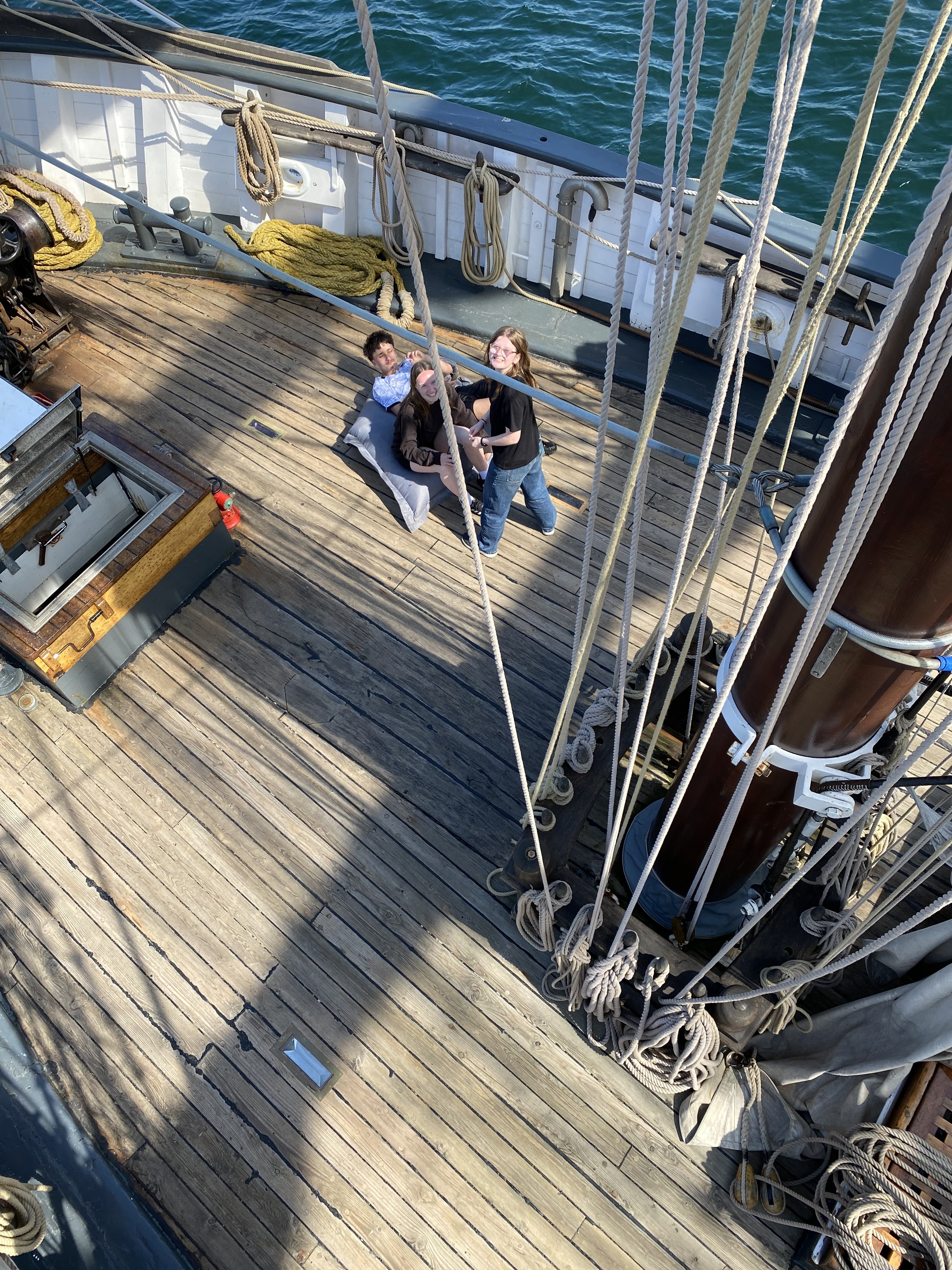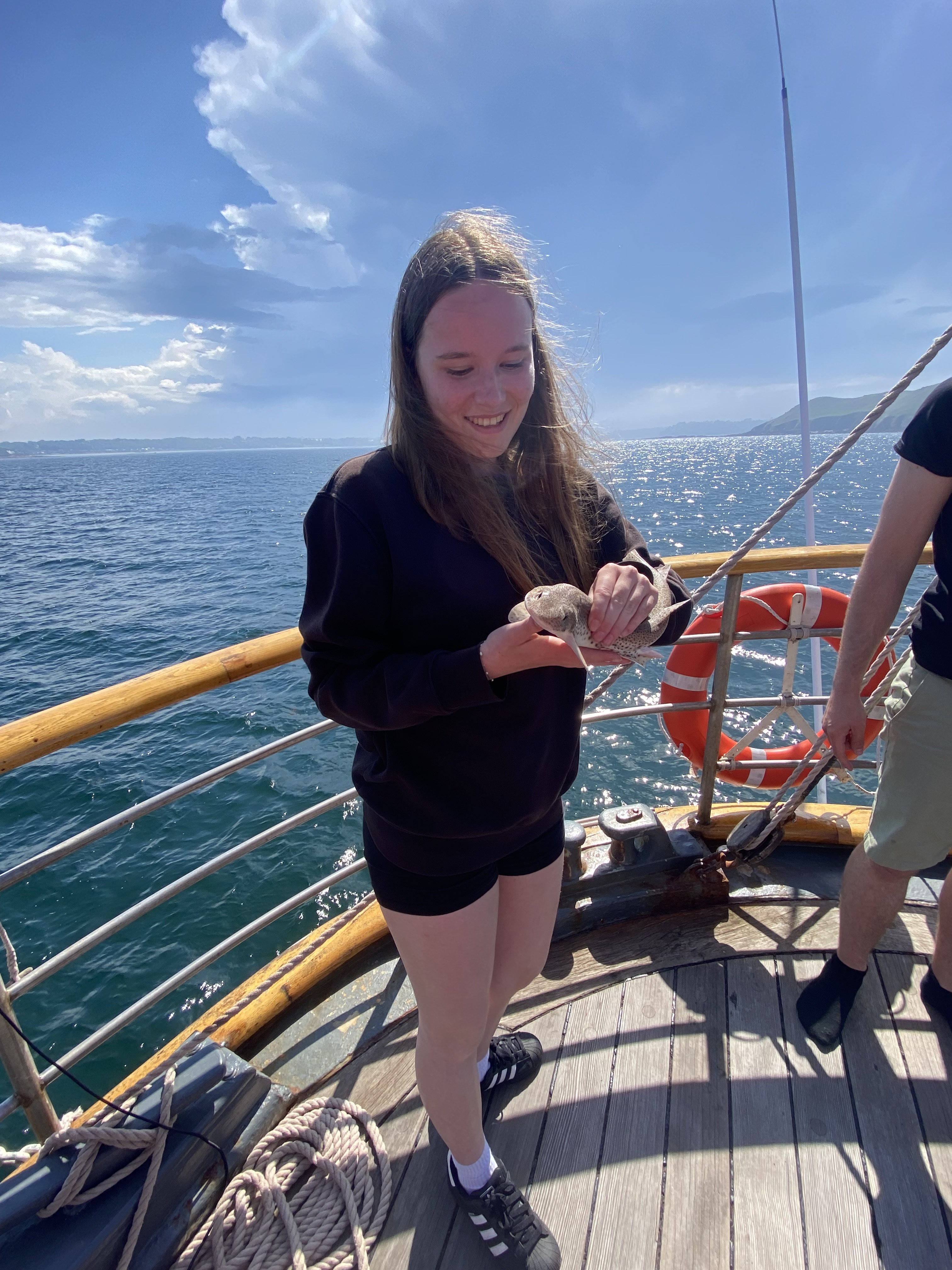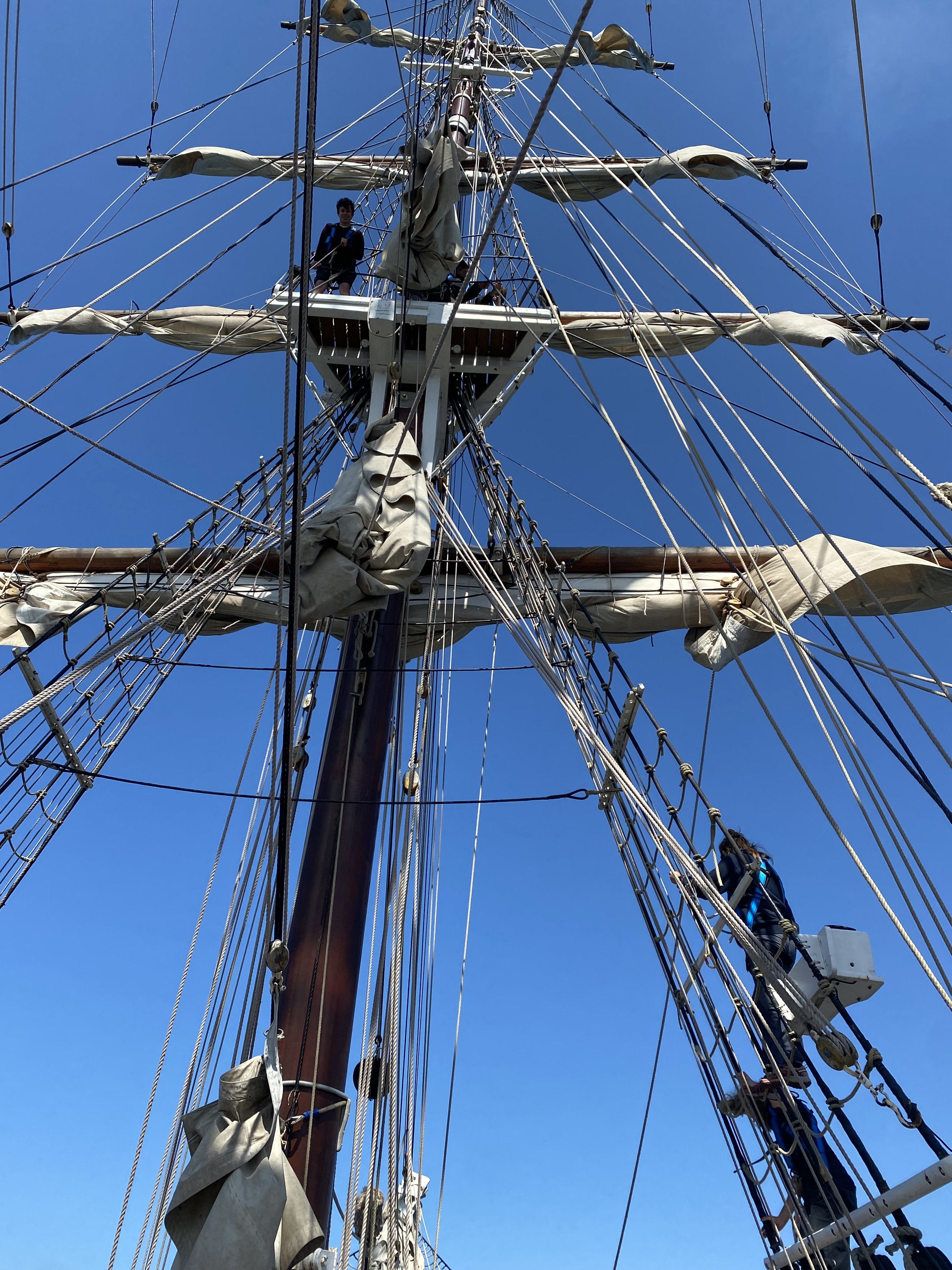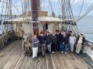Mouillage dans l’après-midi au large de Perros-Guirrec. Les élèves pêchent ou apprennent à grimper aux cordages