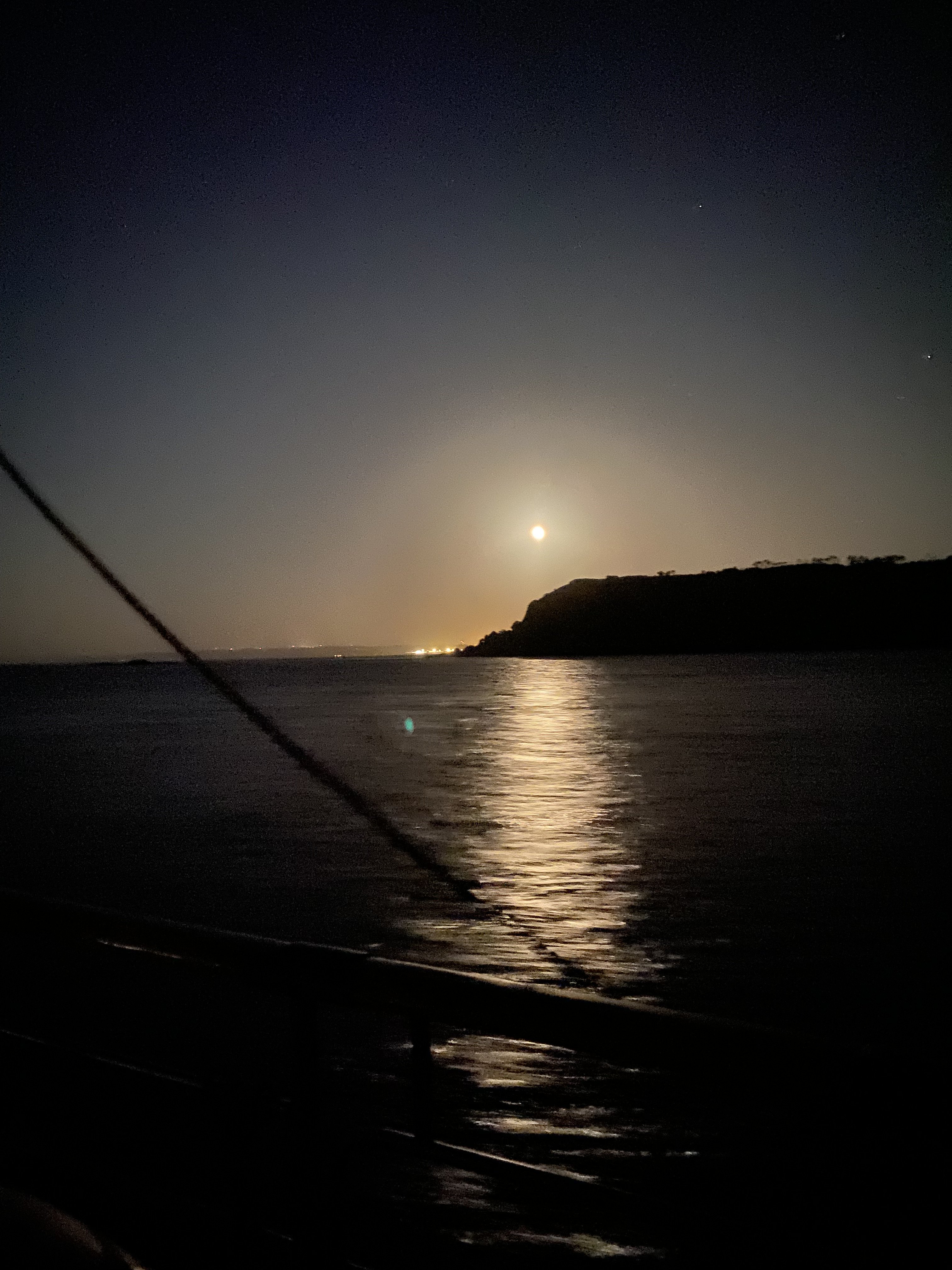Entrée dans la rade de Brest : la pointe des Espagnols éclairée par la lune. Mouillage à l’anse Caro.