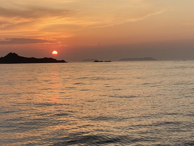 Au large, les îles de Molène et de Ouessant, sous le soleil couchant :