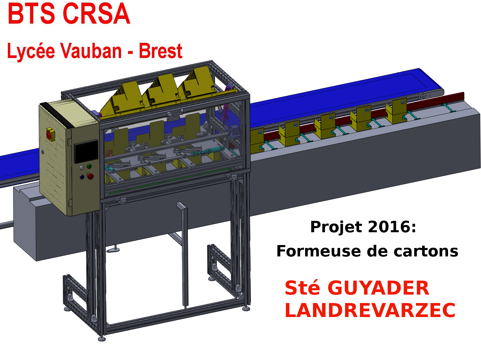 Un groupe d’étudiants a travaillé sur la conception et réalisation d’un prototype dee formeuse de cartons pour la société Guyader à Landrévarzec. Les cartons sont auto-formables et la difficulté est la cadence : 3 boites par secondes !..